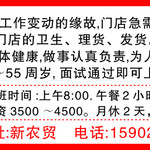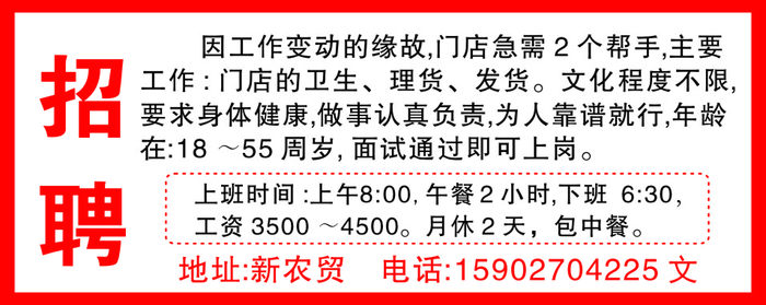 因工作变动的缘故,门店急需 2 个帮手,主要工作 : 门店的卫生、理货、发货。文化程度不限,要求身体健康,做事认真负责,为人靠谱就行,年龄在 : 18 ~55 周岁,面试通过即可上岗,上班时间 : 上午 : 8:00,午餐 2 小时,下班 : 6:30,工资 3500 ~4500。月休 2 天,包中餐。