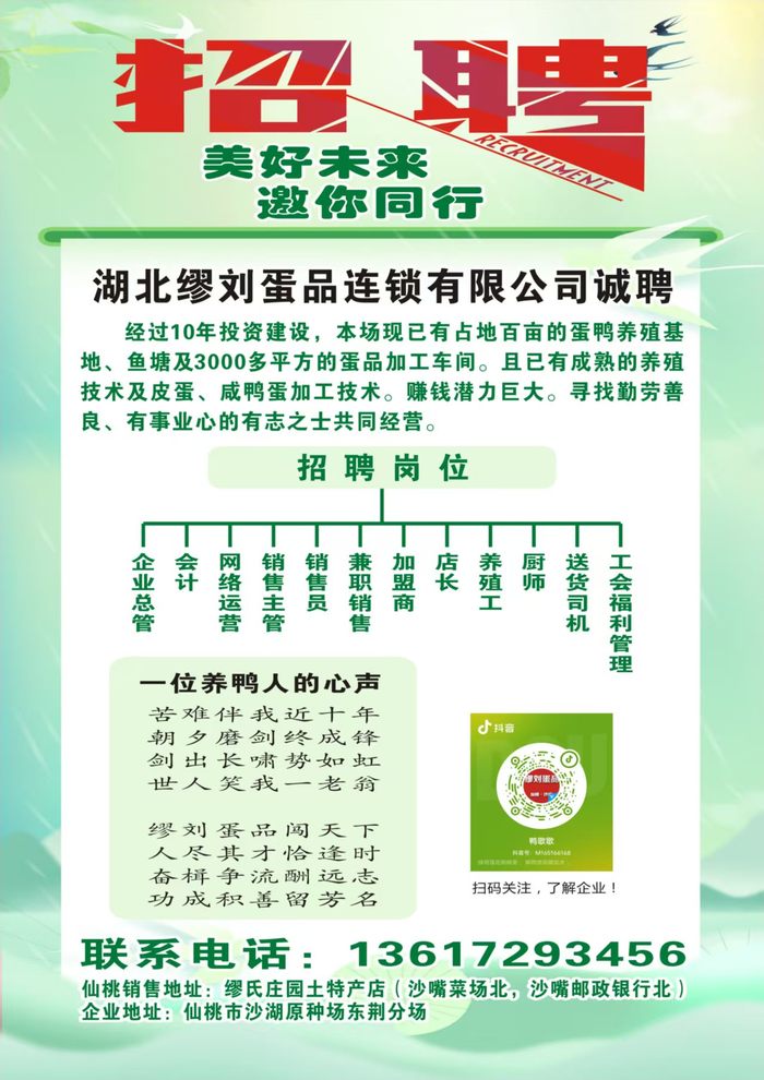 经过10年投 资建设,本场现已有占地百亩的蛋鸭养殖基地、鱼塘及3000多平方的蛋品加工车间。且已有成熟的养殖技术及皮蛋、咸鸭蛋加工技术。赚 钱潜力巨大。寻找勤劳善良、有事业心的有志之士共同经营。